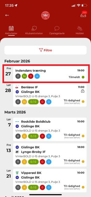 Nu kommer du ind på holdets aktivitetsoversigt, hvor du kan finde alle oprettede aktiviteter (træninger og kampe).