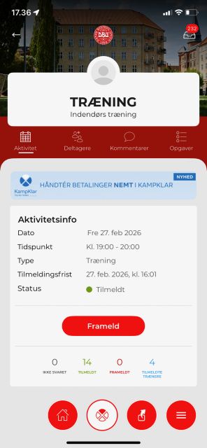 Når en træning bliver lagt ind i Kampklar, så vil spilleren som udgangspunkt være automatisk tilmeldt til træningen (se billede). Det vil sige at træneren forventer at spilleren deltager i træningen, med mindre spilleren går ind og framelder sig træningen.