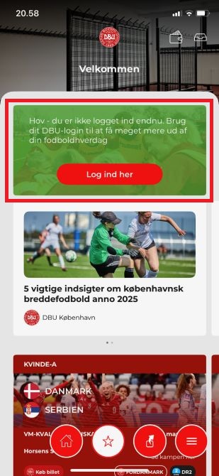 Når klubben opretter dig som spiller, får du tildelt et DBU-login. Det er dette login du skal logge på DBU Fodbold appen med. Tryk på knappen “Log ind her” (se billede).