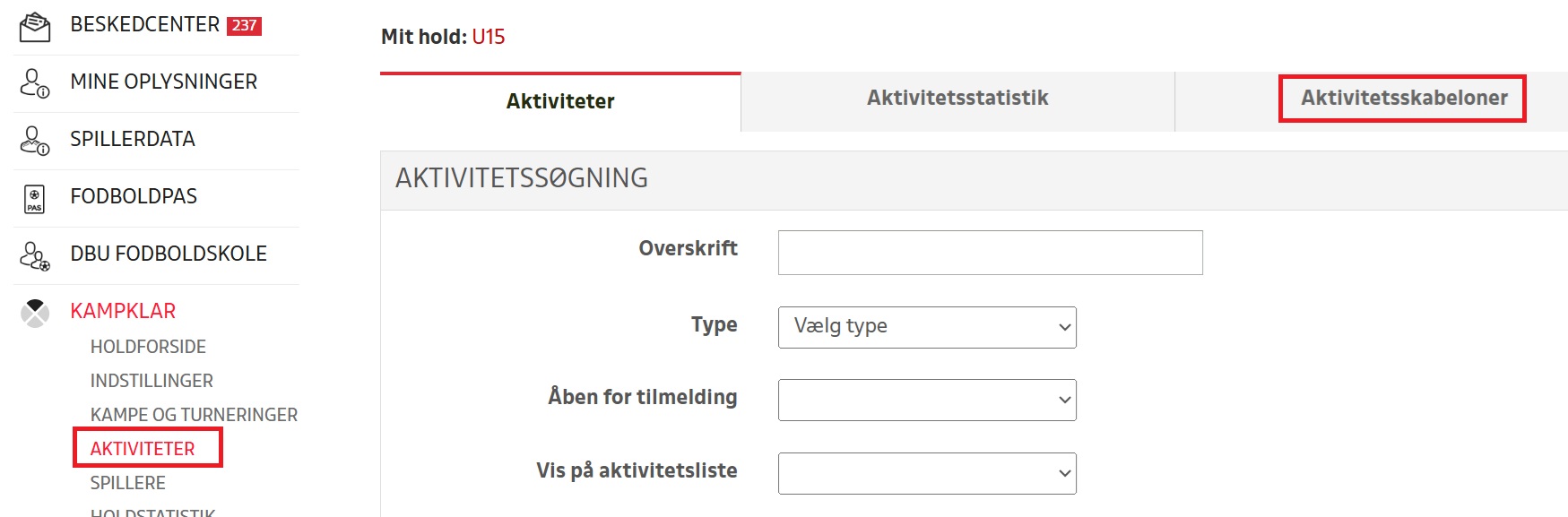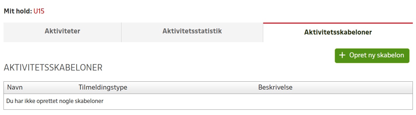 Vælg nu menupunktet “AKTIVITETER”, hvorefter du klikker på fanebladet “Aktivitetsskabeloner” (se billede).