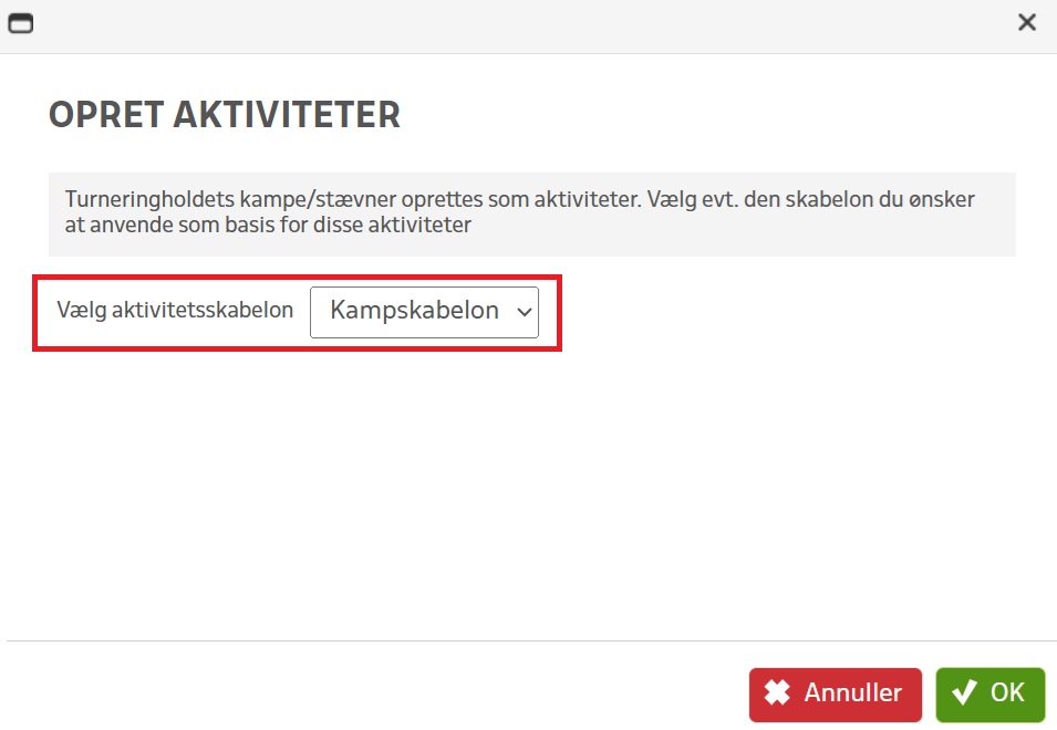 Nu vil der poppe et vindue op, hvor du har mulighed for at vælge den aktivitetsskabelon du netop har oprettet. Vælg den pågældende skabelon og klik herefter på den grønne knap “OK”.